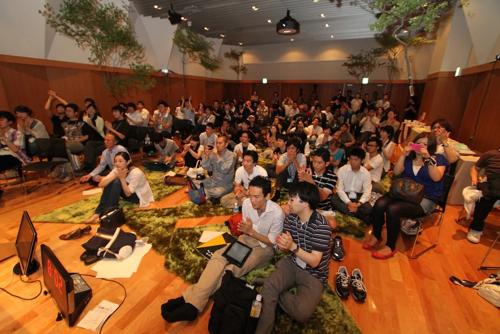 TEDxTokyo yz 第1回のイベントとなる「ver.1.0」は、青山学院大学の新校舎「アスタジオ」の地下ホールにて開催され、「公園」をモチーフとした空間が再現されました。空中には本物の木が吊るされ、床には芝生のようなカーペットが敷き詰められ、参加者は靴を脱いで床に寝転がったり、胡座をかくなど、思い思いの格好でプレゼンテーションを楽しみました。